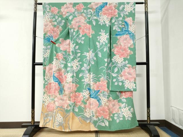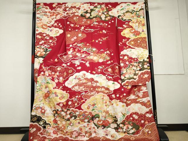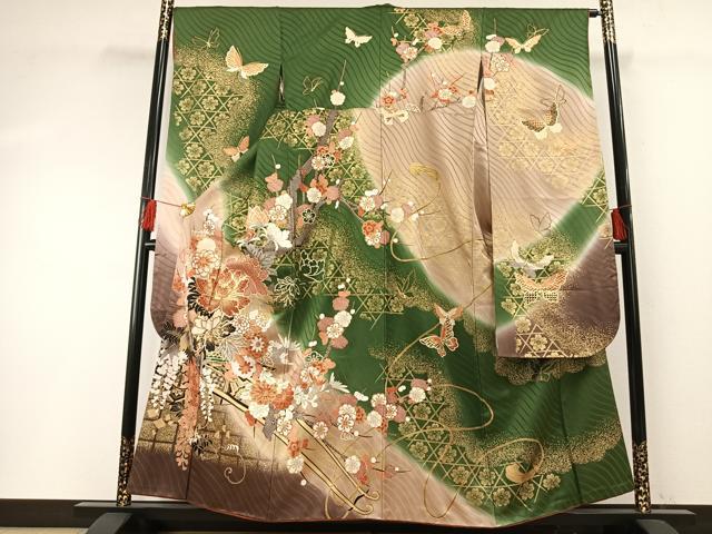 - 平和屋着物●豪華振袖 総絞り 草花文 黒地 金彩 正絹 逸品 AABG6586cs